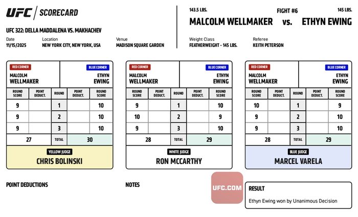 #VeChain #UFC322 Official Result: Ethyn Ewing (30-27, 29-28, 29-28) defeats Malcolm Wellmaker via Unanimous Decision.