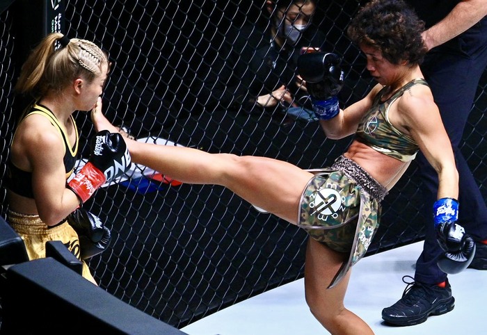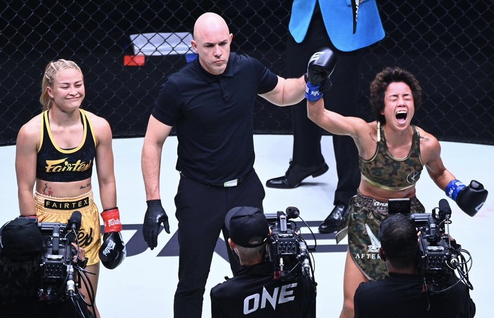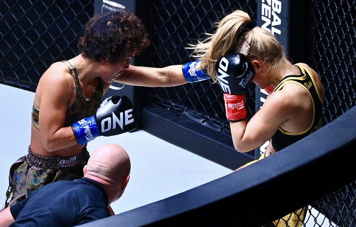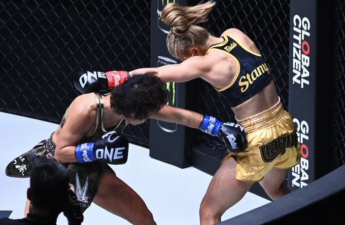 スタンプは、ONEでキックとムエタイの二冠を達成後、MMAに挑戦。22年9月に女子アトム級王座決定戦をハム・ソヒと争い、KO勝利で前人未到の3競技制覇を成し遂げた。