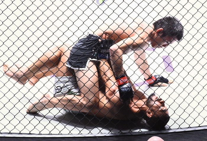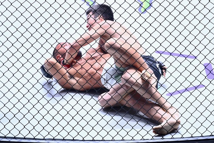 解除した青木は上になりレッグドラッグに。手塚の両腕を抱えた状態でのボディロック。手塚はバタフライガードから青木を蹴り上げるが、青木もすぐに乗り直す。青木が上をキープし、ヒザを押してパスガード、マウントを取る。手塚は腰を押してバタフライフックに戻すと、上の青木が右ヒジ。青木優勢のまま初回が終了した。