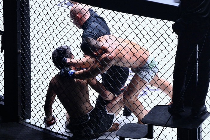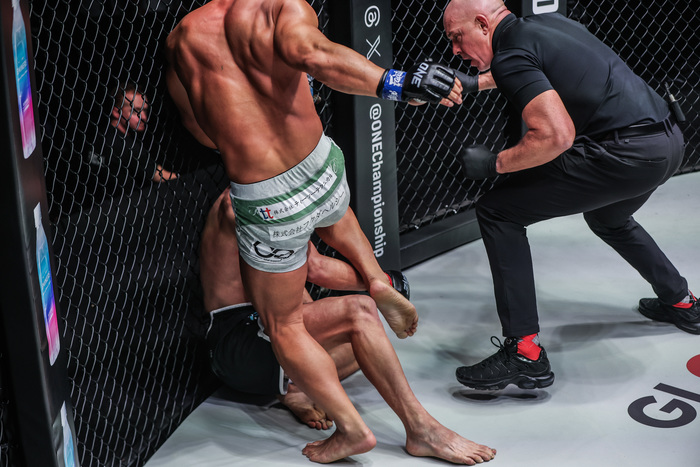 1R、青木はファーストアタックでダブルレッグ、手塚は切って離れるがすぐに青木が2度目のダブルレッグ。これも手塚が切って立ち上がる。青木は首相撲から右ヒジ、2度目の組み際には手塚が右アッパーを打つが、組んだ青木が直後に後方にテイクダウン。トラックポジションに。ケージを蹴って背中を着ける手塚に、青木はシングルバッグからツイスターの体勢になり頭を引き寄せる。両手でフレームを作る手塚は顔を遠ざける。それでも青木が両手を首に掛ける。
