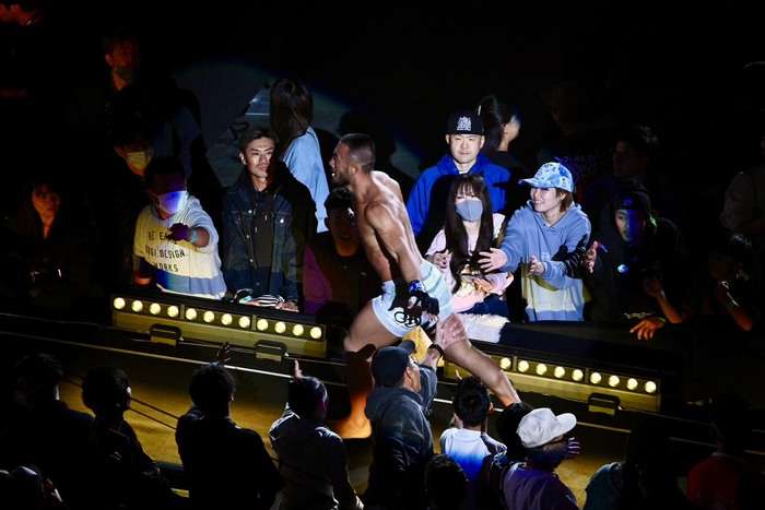 手塚は英語で「これは俺の階級、俺のベルト、俺の時代だ」とクリスチャン・リーへの挑戦をアピール。「ツイスターでマジで脇腹いてぇ。めっちゃ効いた。さすがレジェンド青木真也ですよ。リスペクトしています。昨日フェイスオフで乱闘でぶん投げられた時にヒジもすり切れたし、Amazonで2000円で買ったネックレスも切れちゃったのでボーナス欲しいな」とアピールしたが、今回もボーナスは出なかった。