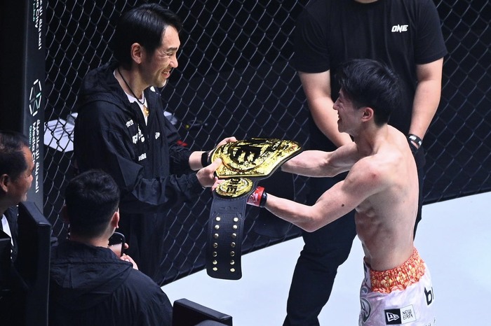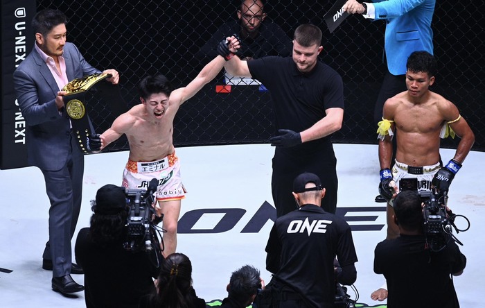 判定3-0で名高が勝利、日本人初のONEムエタイ世界王者(初代)となった。ONEの大きなベルトを肩に掛けた名高は「応援してくださった皆様、ありがとうございます。ヌンスリン選手、7戦7勝で来ていて試合前は凄く練習しているって樹夫報も入っていて普段で怖い気持ちもあったんですが、中川会長、ジムの皆様、サポートしてくる皆様、そして応援してくれる皆様のおかげで自信をもってリングに立つことが出来ました。ありがとうございます」と勝利者インタビューに答える。