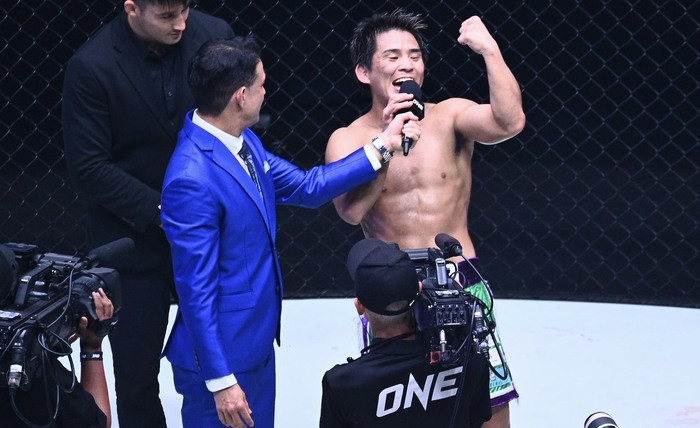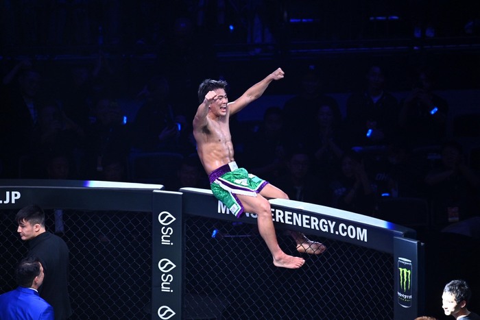 「よっしゃーっ! リングに上がるまでは自分が一番弱いと思って練習して、リングに上がったら自分が最強だと思って試合して。スーパーレック選手はオーラがあったんですが、自分を信じて、チームを信じて戦いました」と勝利者インタビューに答えた与座。