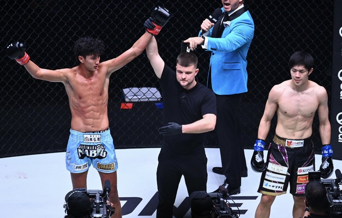 「皆さん、本当にありがとうございます」と日本語で挨拶したアナン。「1Rは強い打撃を当てられると思って一発当てられました。でも、新しい階級でガス欠するかもと思ってちょっと引いていたけど、いい結果になってこれからフェザー級でやっていける自信になりました」と、フェザー級での試運転だったとする。