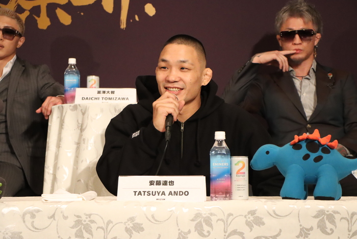 安藤は「やっとここに呼んでもらえたので、しっかり期待に応えられるようにここから残りの40日くらいあると思うんですけれど、自分と向き合ってしっかりやっていきたいと思います。福田くんはすげぇいい選手だと思ってて、俺マジ超リスペクトしているので、その福田くんと試合できるこの大きな舞台にチャンスもらったのでばっちり面白い試合をして。どっちが勝つか分からないけれど、どっちも狙いに行くと思うのでバチバチの試合展開になると思うのでよろしくお願いします」との意気込み。