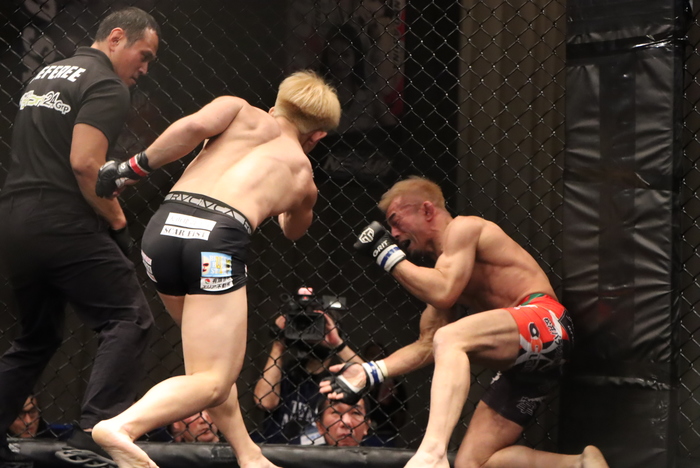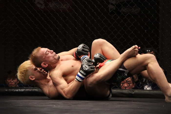 1R、岩松の組みをがぶる塩谷はダース狙いつつバック、正対する岩松はディープハーフから脇差しに行くが、潰す塩谷がバック。リアネイキドチョーク狙いからパウンド、金網背に座る岩松にパウンドでレフェリーが間に入った。