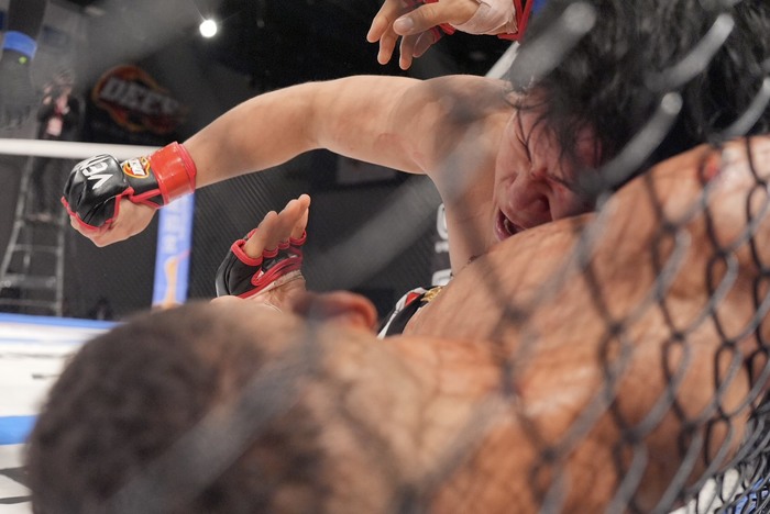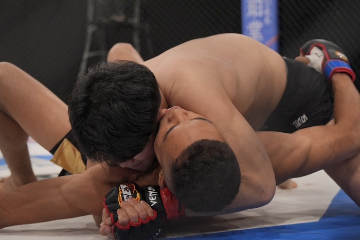 中谷は左目尻をカット。四つに組んで小外がけテイクダウン。ハーフから細かいパウンド。さらに背中を着かせてパウンド。アニンタが片ヒザ立ちまで戻す。