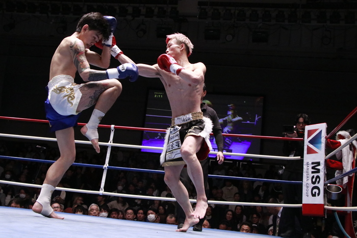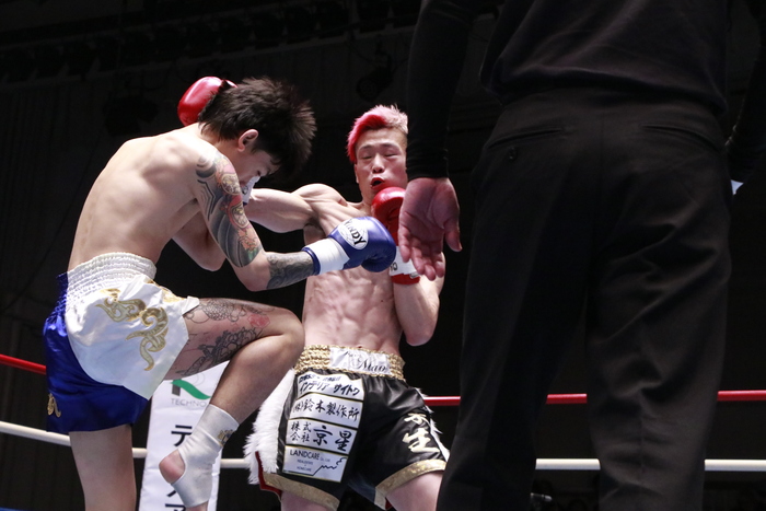 2R、西原は一発一発が強いジャブ、右フック、右アッパー。後ろ蹴りも放つ。これにローマは前に出てきて徹底したヒジ狙い。何度もヒジが空を切る。
