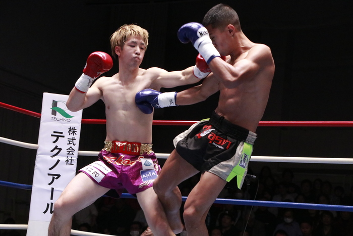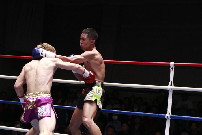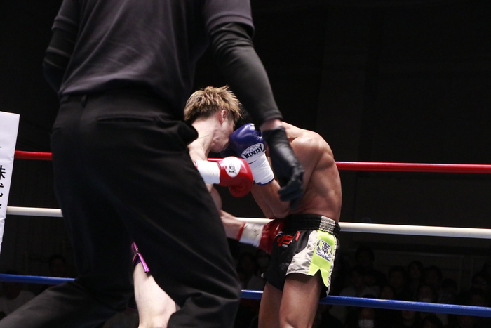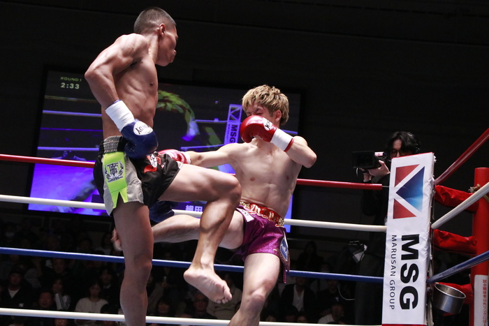 1R、強い右ローを蹴り合う両者。ソッサイは左ミドルも蹴る。細田は右ボディストレートを当てていき、素早い出入りで左右ボディを当てていく。