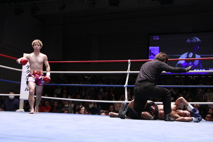 そのボディが強烈に決まると、ソッサイは悶絶してダウン。苦しみながら10カウントを聞いた。