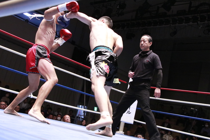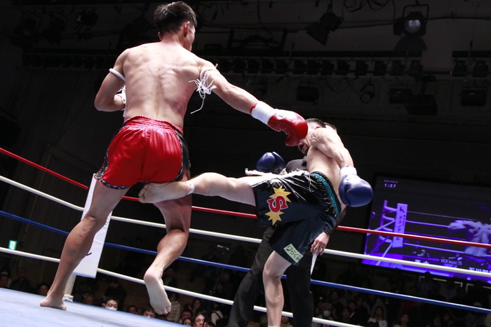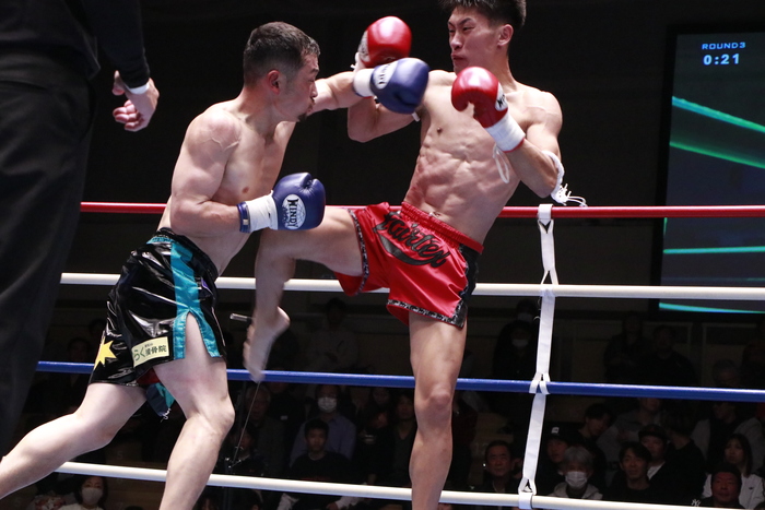 3Rもパンチからの左ローで攻める海士は左ストレートをヒットさせる。石川は組んでのヒジ&ヒザに活路を求めるが、ブレイクになると海士のワンツー、左ローをもらう場面が目立つ。