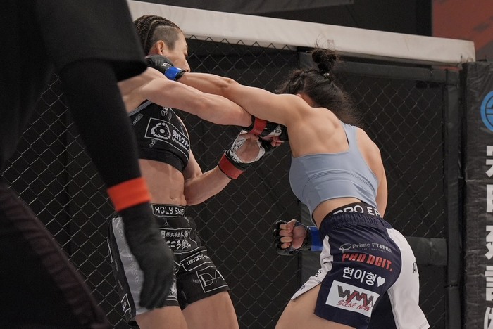 プレッシャーをかける浜崎、イェジは右ハイをヒット。前蹴りの打ち終わりに浜崎は左で詰める。右カーフの浜崎。イェジは右ローもそこを崩した浜崎に、下から腕十字を狙うイェジ。