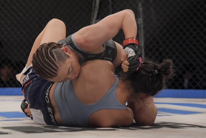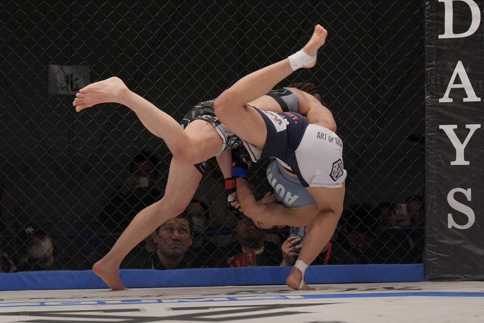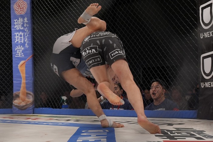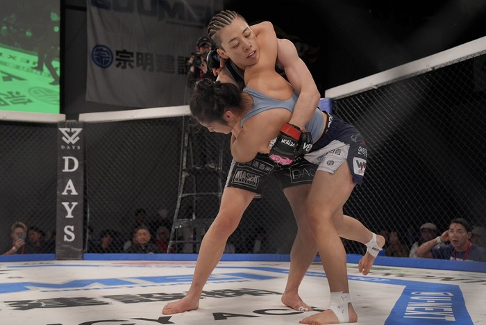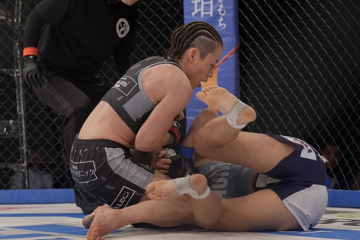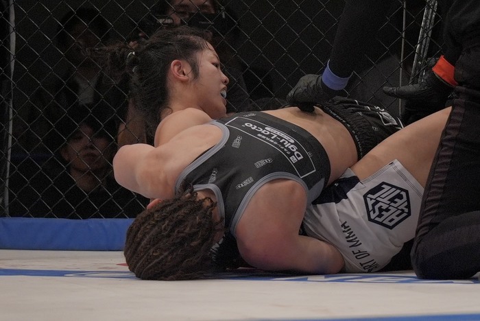 引き手のヒジを持ち、前後に煽る浜崎。押し込む浜崎。離れたイェジは左右で前に出るが、組む浜崎が崩してバッククリンチ。手首を持つ浜崎は再び払い腰テイクダウン! 最後に手首を掴んで前転させて極めに行くがゴング。