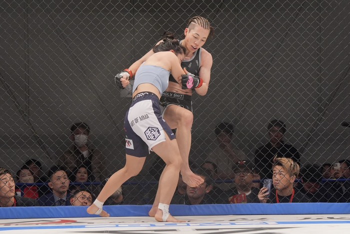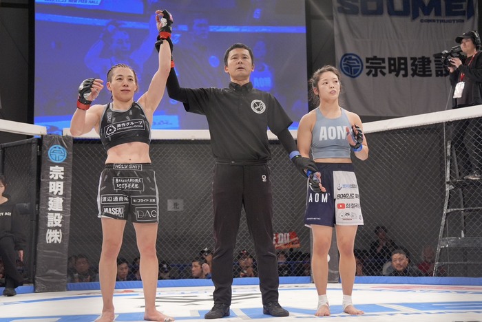 判定3-0(30-27×3)で浜崎が勝利。「前回負けてから少し落ちたんですけど、たくさん応援してくれる方がいて励みになって頑張ることができました。今日、一本極めきれなかったんですけど、勝てて正直安心してます。たくさん応援来ていただいて本当にありがとうございました」と語った。
