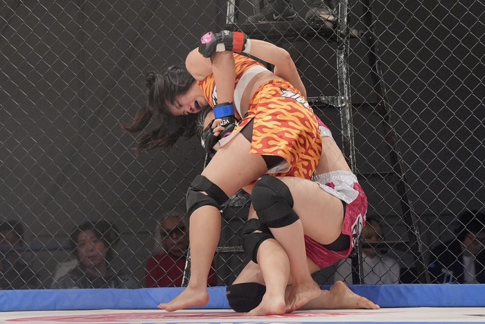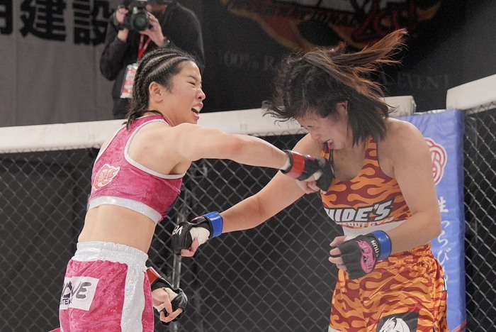 左の蹴りのちゃんりなに右フックからダーティボクシングのたから。その組みにニンジャチョークを狙うちゃんりな。ヒザを連打しゴング。