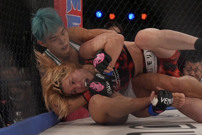 1R、サウスポー構えから左の蹴りの彩綺。パク・シウは組んでバッククリンチから足払いで崩すが、彩綺もすぐに立つと右小手で正対。左足をかけるパク・シウにバックに回させない彩綺。ならばと後方に崩して手を着かせて背中に乗るパク・シウ。