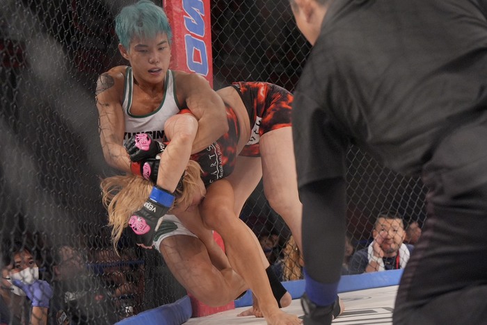 彩綺は25年3月に青野ひかるに判定負けも、5月にSAAYAを相手にテイクダウンの動きも見せて、スプリット判定勝ち。ともに打撃を武器とするなか、MMAで上回るのは?