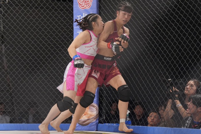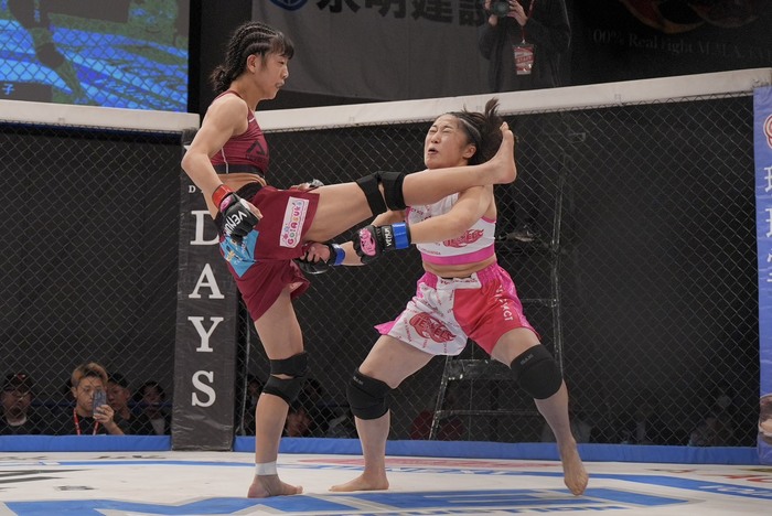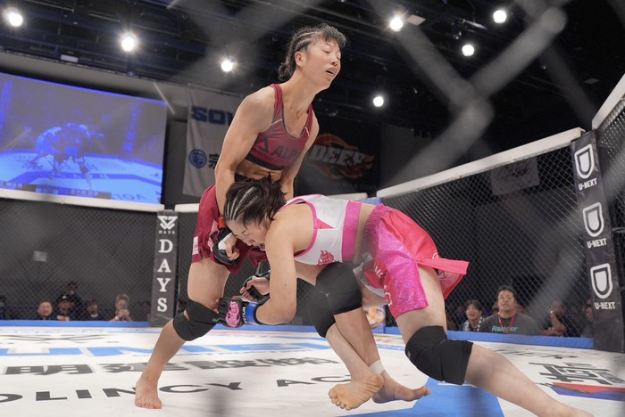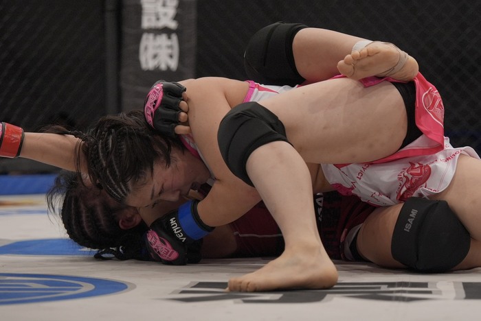 1R、ジャブを突く横江に、組んで差して投げる五十嵐。ハーフの横江に背中を着かせて左枕で寝かせて右でパウンド。