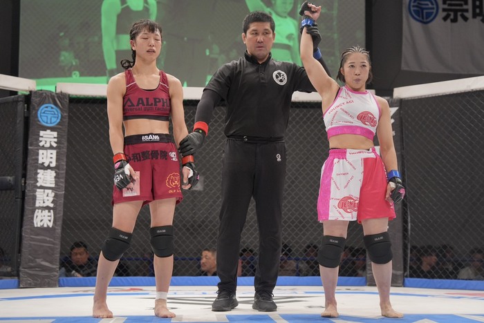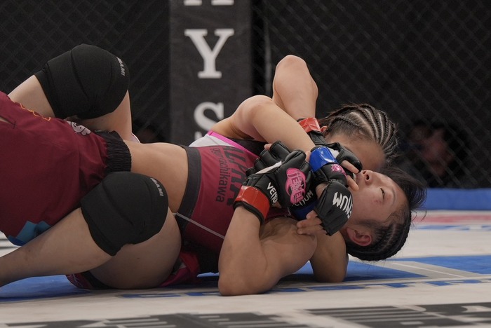 2R、柔道ベースで組んで奥襟を持ちに行こうとする横江にヒザを突く横江だが、五十嵐はシングルレッグテイクダウンからバックに。正対した横江にハーフから左枕で寝かせて横江の動きに合わせてバック、肩固めへ。サイドに抜けるが、内側を向く横江は肩固めを向けると、五十嵐はパウンドに移行。ゴング。