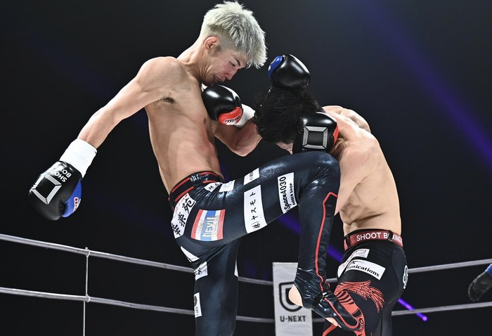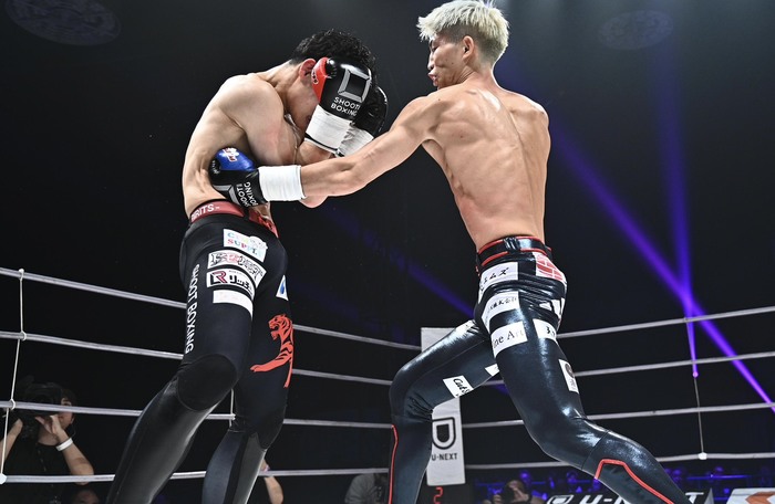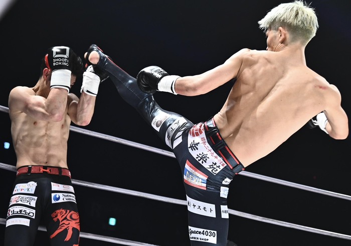 1R、サウスポーに構えた安本が左ミドルで先制し、左ローを蹴って前へ出る。さらに左ストレート。山田は左インロー。左の蹴りで前へ出ていく安本に右ストレートを打つ山田だが、そこへ安本も右ストレートを連打。前へ出る安本が右ストレート、左ミドル。山田は右インロー。山田が左ボディを当てると、安本は左フックを返す。