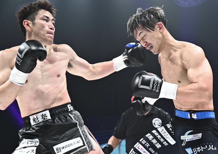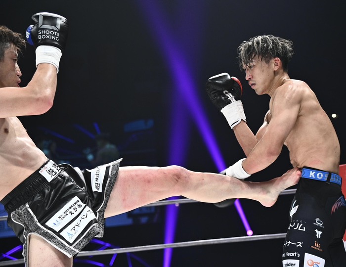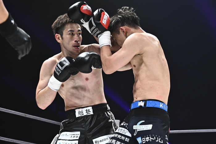 判定は三者三様でドロー、延長戦へ。都木がワンツー、組みに行くが憂也は組ませない。前へ出て右を狙う憂也に都木が組み付きに行く。ブレイク。都木がジャブからワンツーと前へ出て、憂也は右ボディと左フック。組んでヒザを蹴る憂也に都木もヒザを蹴り返す。互いに組んでヒザを蹴り合う。