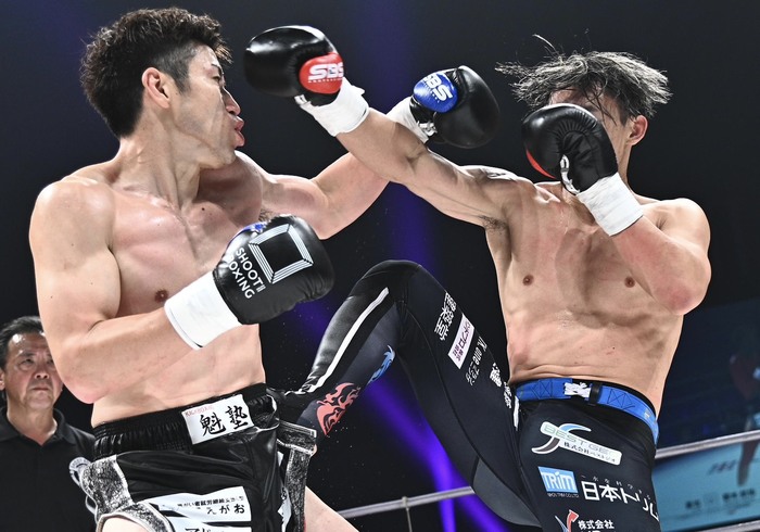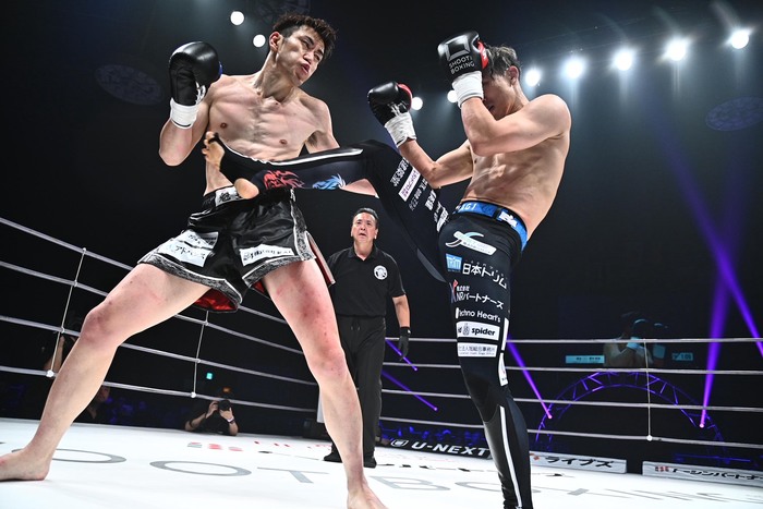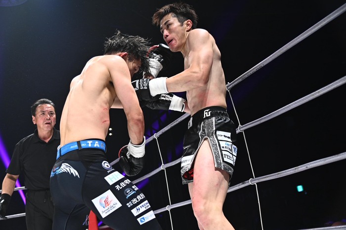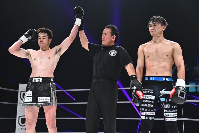 3R、じりじりと距離を詰める憂也が飛びヒザ蹴り、都木は組むと投げを狙うが憂也がディフェンス。離れると憂也は左ミドル、都木も右ストレートを返す。細かく連打を当てる憂也に都木は投げを狙うも憂也は投げさせない。都木のジャーマンも憂也が足を掛けて防いだ。憂也の左フックに都木は組み付いて首投げも失敗。憂也がワンツー、都木が前蹴りからワンツーの連打で前へ出たところでゴング。