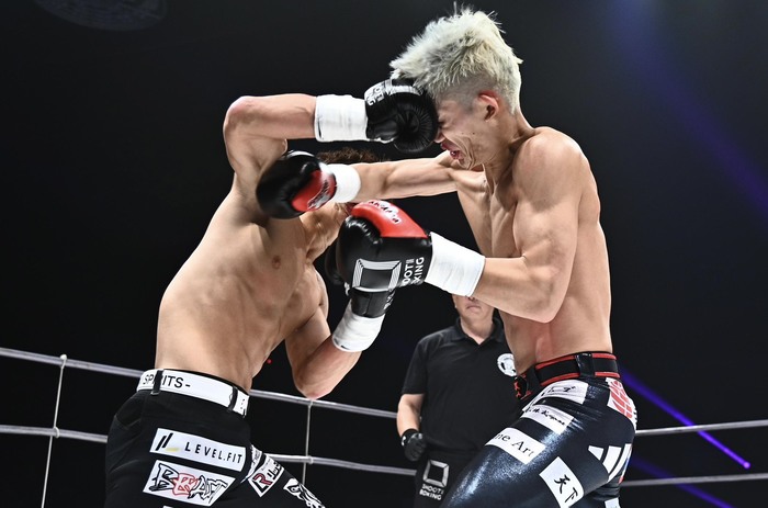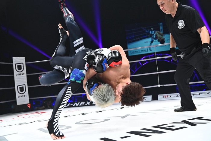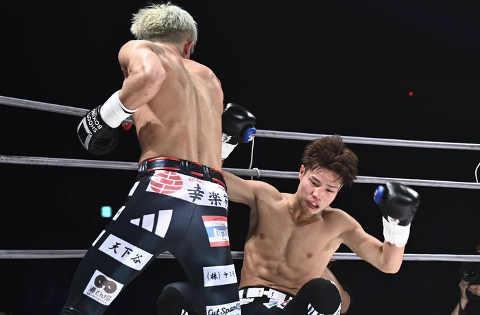 1R、両者とも左右にスイッチしながらステップを踏み、安本はミドルキック、山田はローキック。安本が右ストレートを当て、距離を詰めての右ストレートでダウンを奪う。左フックからの右ハイ、右フックには山田も右フックを合わせに行く。組み付くと山田がシュートポイント1点を奪う。