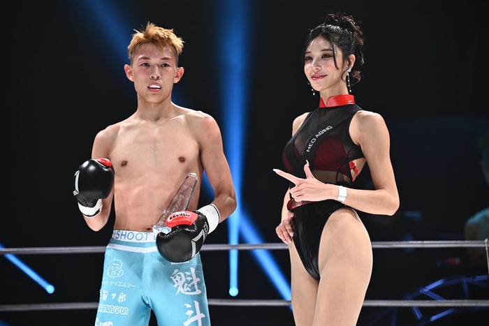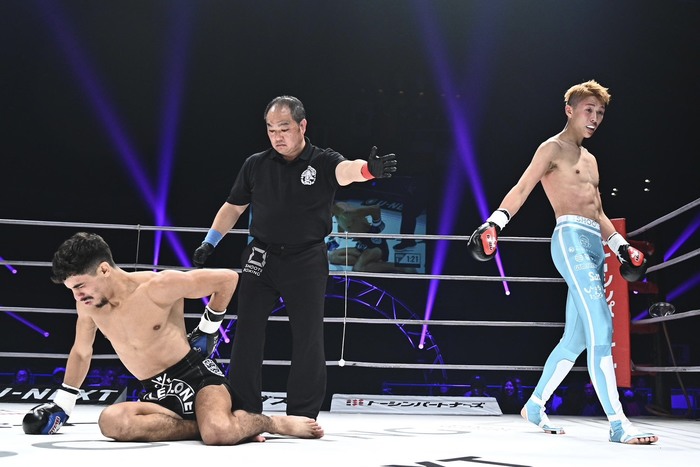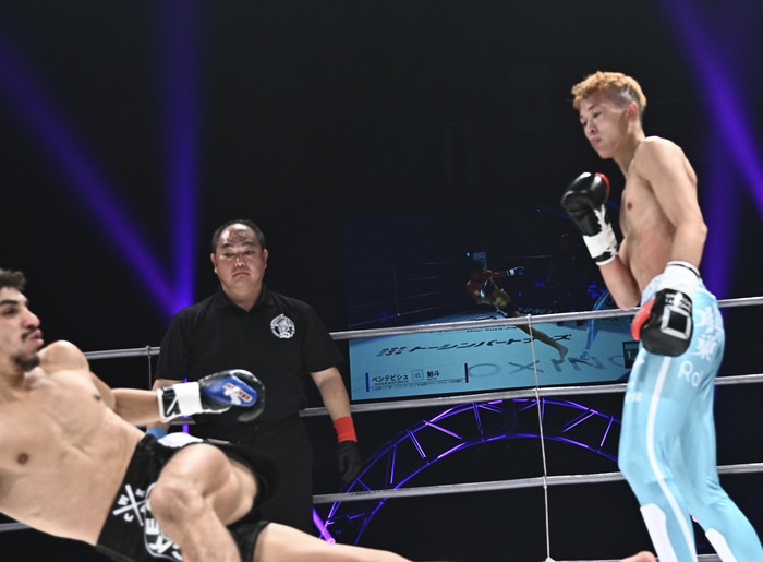1R、魁斗は右ストレートで入り込むと、そのまま組んでヒザ。ベンテビシュが左ハイキックを空振りしたところで、軸足が滑り、転倒。腰を打ち付けてそのまま立つことが出来ず、魁斗のTKO勝ちとなった。