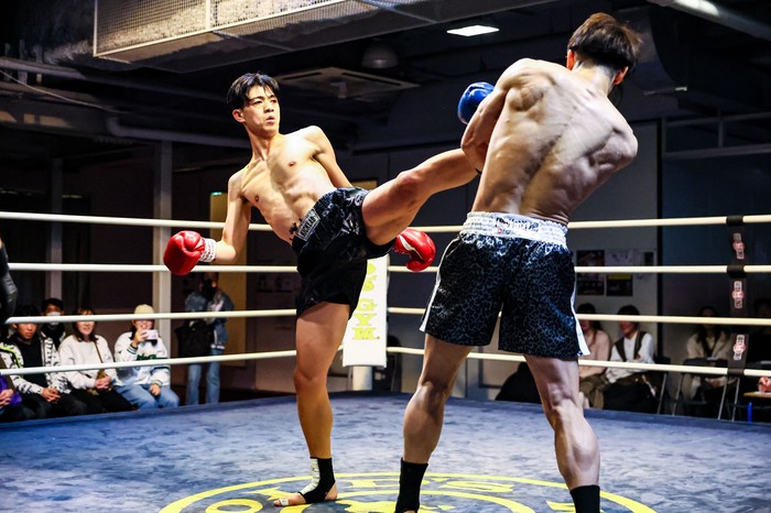 2R、前進する齋藤に、小野寺は前蹴り、ミドル、左ハイ。構うことなく齋藤は前進すると、小野寺はヒザ蹴りからパンチ連打につないで削る。小野寺のテンカオが何度も突き刺さり、齋藤は大きく後退した。