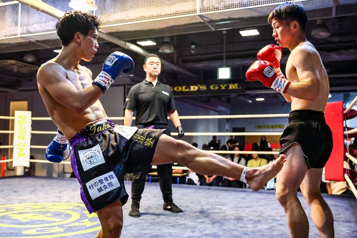 2R、蹴りを散らす梅田に、TAKUも左ミドルを増やして前に出ながらパンチ連打で詰める。梅田は右ミドルで距離を取るが、TAKUペースに。