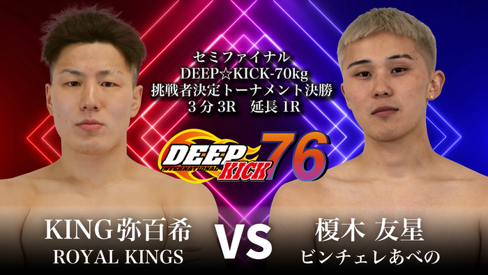 5月にDEEP☆KICK-70kg第5代王者に輝いた本野有哉(照道会)への挑戦権を懸けたトーナメント決勝戦で、同級1位のKING弥百希(ROYAL KINGS)と同級3位の榎木友星(ビンチェレあべの)が激突する。