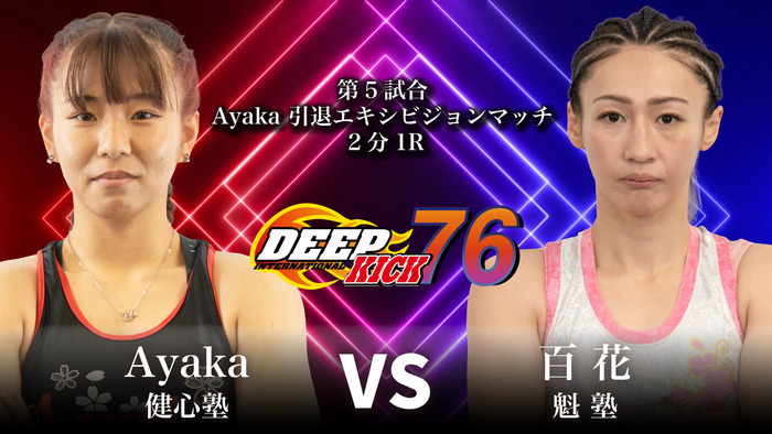また、元ミネルヴァ日本ピン級王者・WBKF世界女子ライトフライ級王者と2本のベルト戴冠歴のあるAyaka(健心塾)が引退を表明。それに伴い引退セレモニー及び引退エキシビションが行われる。エキシビジョンの相手はDEEP☆KICK QUEEN -46kg1位の百花(魁塾)が務める。