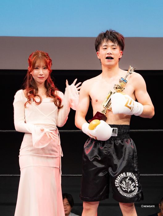 メインの勝者、斉藤とオフィシャルサポーター日南まみ