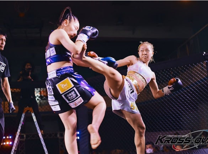 2R、距離を掴んだ鈴はミドル、ロー、前蹴りと巧みに蹴り分ける。被弾しながらもチャンスを狙う町屋は圧力をかけながらパンチを振るっていく。