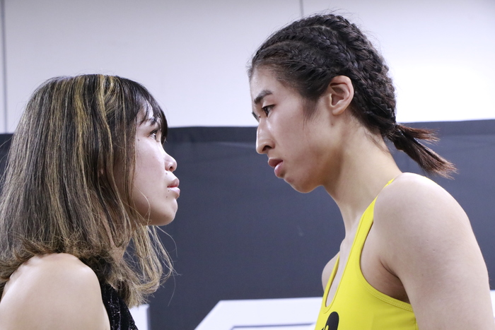 また、第4試合の「日韓交流戦」NJKFフライ級3分3R延長1Rで対戦する、S-1女子世界ライトフライ級王者・真美(team lmmortal)とジョン・アヨン(韓国)は、超接近してのバチバチのにらみ合いを展開。闘志を全面に出していた。