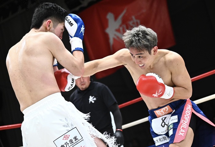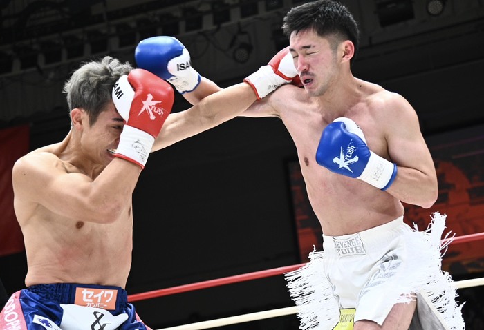 1R、開始直後にいきなり後ろ蹴りを放つ篠原、大岩はかわす。篠原はスイッチを多用してジャブ、大岩は右ストレートを打ち込んでいく。篠原はジャブから左ボディ、右アッパーは空振り。大岩が踏み込んでのワンツー、前へ出ると右インロー。