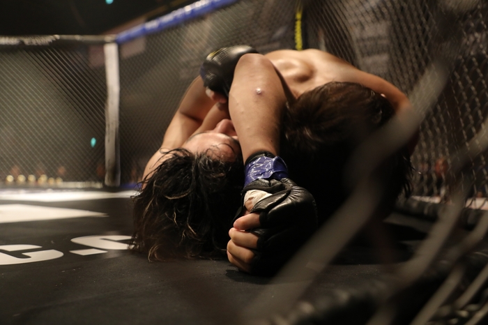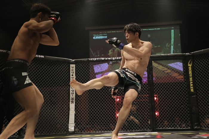 2R、左で差して組むKENZOに、左のギロチンの望月だが、首抜くKENZOは望月の立ち際にスタンドバックに。離れる望月は右ロー。さらにワンツーで詰めるが、いなしたKENZOがテイクダウン。