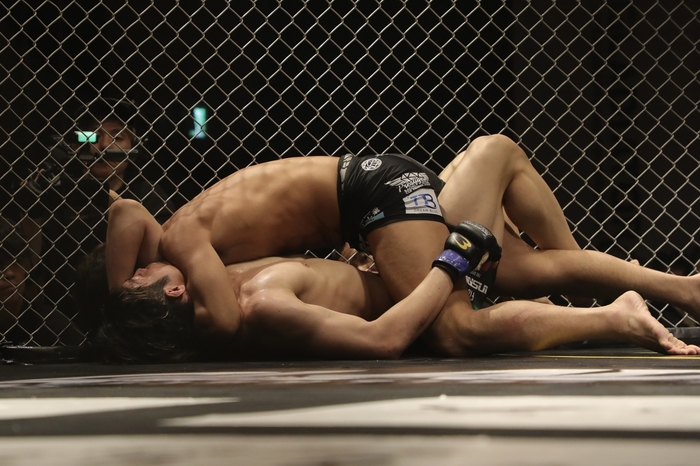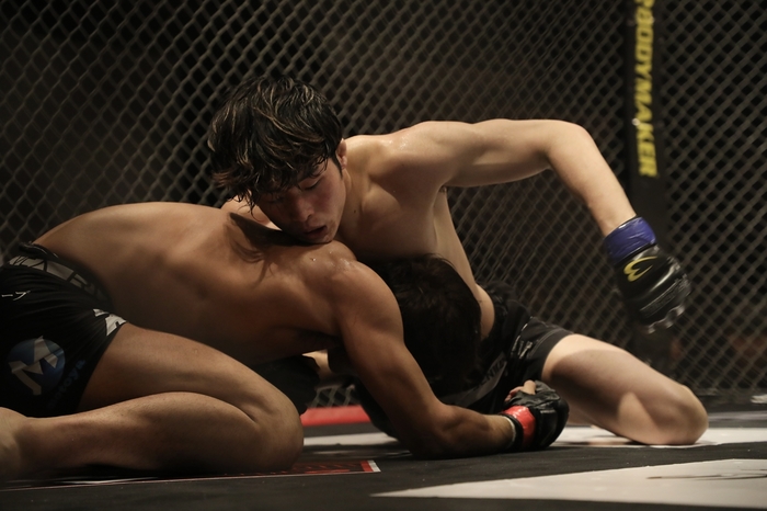 1R、右を振って左で差して組むKENZOに、望月は右小手。シングルレッグに移行のKENZOを差し上げる。両差しで崩すKENZOは右小外刈でテイクダウン。背中を着かせて首を抱えて右の細かいパウンド。ハーフの望月の左脇に頭を突っ込み肩固めへ。KENZOは側頭部に手を当てて防御。