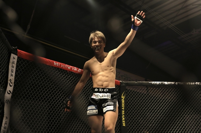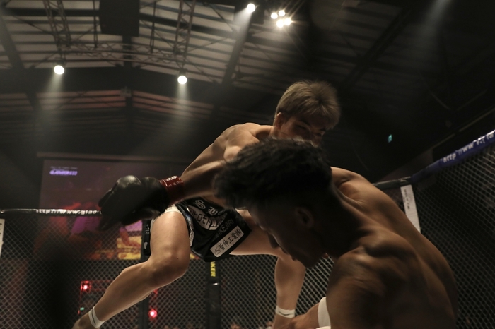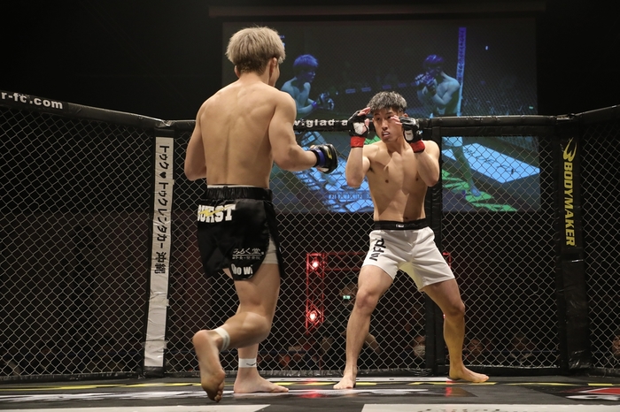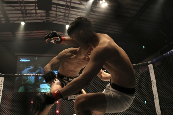 1R、サウスポー構えの山下に、オーソの谷川。山下は左回りで左前蹴り。谷川は外足を取って右ストレートの飛び込み! ダウンした山下にマウントでパウンド。レフェリーが間に入った。