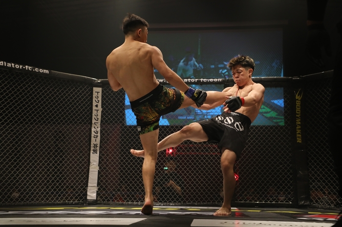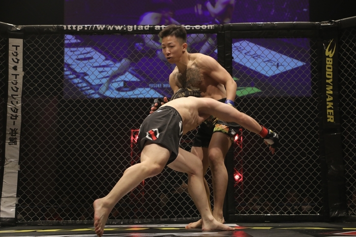 2R、右ロー2発はタッキー。諸井は3発目に組み。右で差して押し込むが、右ヒジのタッキー。ボディロックした諸井にタッキーは左差しで腰を落としたところを諸井はテイクダウン。ハーフのタッキーにヒジを押し付けサイドに出た諸井はヒジ。
