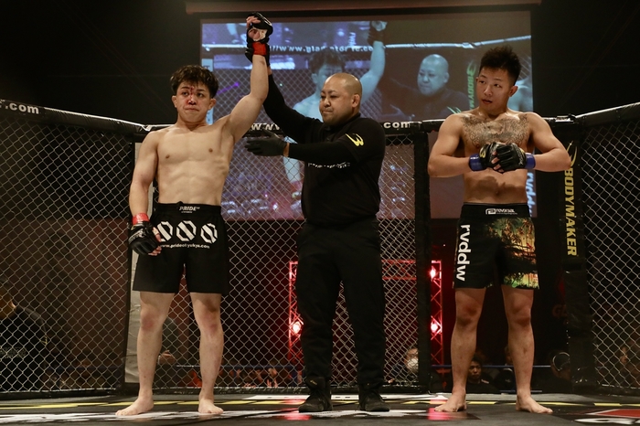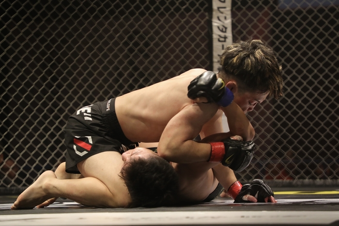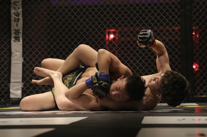 右手を喉元に入れるが左手を掴むタッキー。再びマウントに戻る諸井はパウンド。ブリッジで返そうとするタッキーを寝かせてサイドからヒジ、ボディにヒザ。腕固めを仕掛けるが、そこで上を取り返したタッキー。