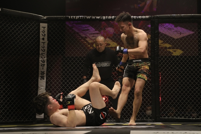 インサイドガードから右のパウンド、ヒジ。諸井は眉間から出血。タッキーは立ち上がり足に蹴りも、諸井にドクターチェック。再開。タッキーの左に諸井が右を振って組んでゴング。