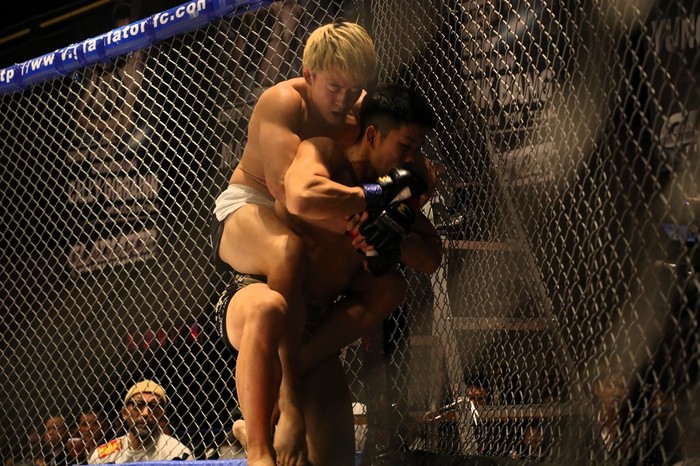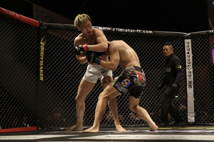 2R、首相撲ヒザの小森。田中の左ミドルを掴んでテイクダウン。フックガードを潰してトップに。ケージまで這う田中を詰めて右足を腿に乗せてから引き出し寝かせようとする。ケージづたいに立つ田中は背中を譲らずシングルレッグから胸を合わせて押し込み。小森の左脇に頭を潜り、四つから崩しも、小森も立ち際にヒザを突く。体を入れ替えた田中はシングルレッグから軸足を払いテイクダウン。小森も手首を掴まれる前に立ち上がり。
