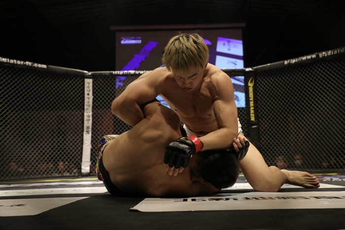 1R、四つに組み、右で差して小外がけテイクダウンの小森。レッグドラッグで押さえ込み、田中の立ち上がりに合わせてバックに。背負って立つ田中。着地し左足をかけて崩す小森。右足フックに変えた小森は自身の左ヒザ裏に右足をかけて左手首をコントロールに。背後にパンチの田中に、小森は右ヒザをバックからこつこつ突く。小森のラウンドに。