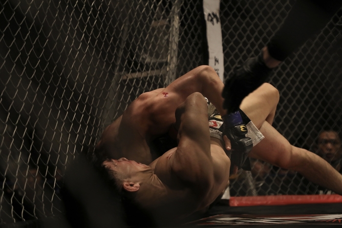 右小手と右足で煽る岩崎の立ち際にバックを奪う今井に正対する岩崎は自らシングルレッグに。右に頭を出した岩崎に、片足立ちの今井はノーアームギロチンチョーク! 中腰の岩﨑からタップを奪い、2回目の挑戦で第6代フライ級王者となった。
