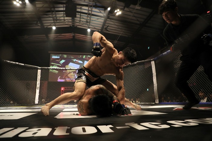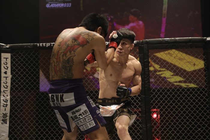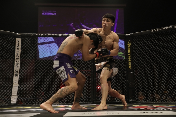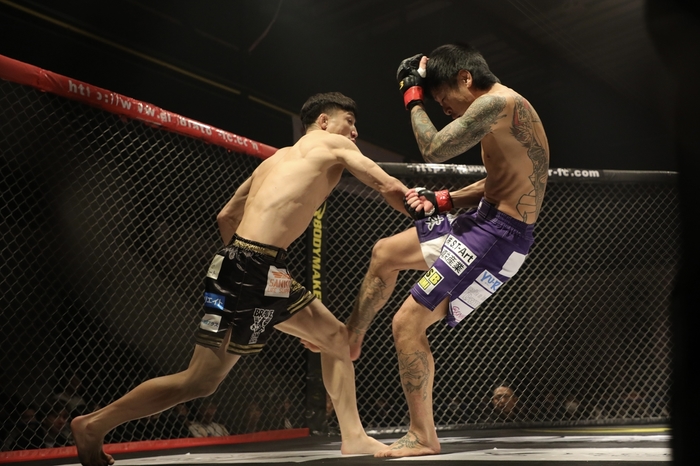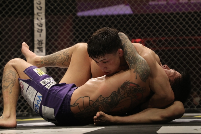 ジャブの刺し合いから右カーフの久保、そこに右オーバーハンドの熊崎。右アッパーも狙う。左ジャブの刺し合い。シングルレッグの熊崎を後方に回す久保だが、そのままトップを奪う熊崎は久保を自身の左腿の上に乗せてノースサウスのドラゴンスリーパー。抜ける久保を抑え込んでゴング。