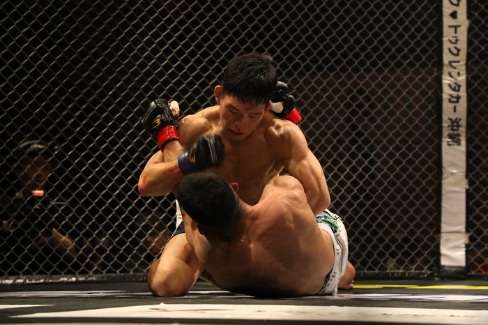 ケージを蹴る上田を横に寝かせて左右ヒジ、鉄槌。右足を抜く。再び出血した上田は下から二重がらみも立ちには行けず。潜らせない吉野はハーフから脇を差してきた上田に鉄槌連打でレフェリーが間に入った。
