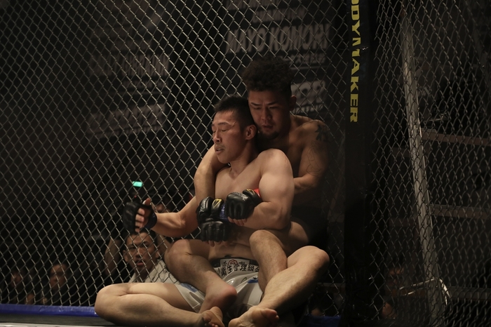 1R、いきなりダブルレッグに入った國頭は首投げからすぐに仰向けになりバックテイク。両足をかけてリアネイキドチョーク狙い。シングルバックに変えた國頭。両足フックするとボディトライアングルにアゴ上から絞めてタップを奪った。