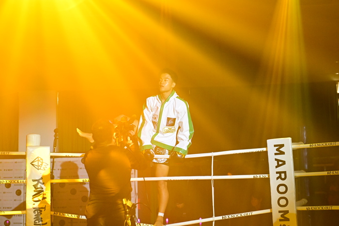 飛び蹴りからワンツーで襲い掛かる成尾。下地は右ストレートのカウンターを狙うが、成尾がヒザ蹴りから左右の連打、そして右ストレートを打ち抜いて2度目のダウンを奪う。ここで下地のセコンドからタオルが投入され、成尾の豪快KO勝ちとなった。