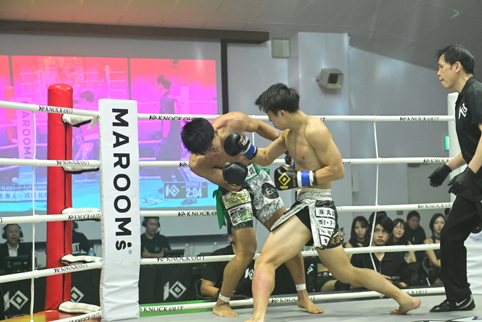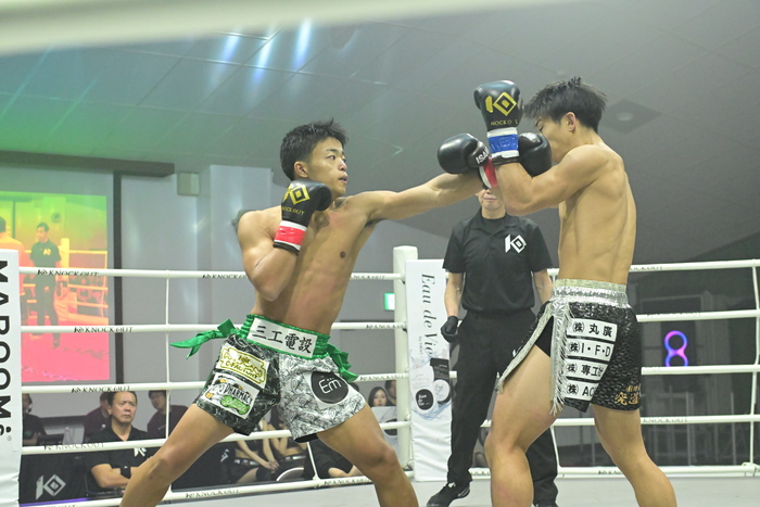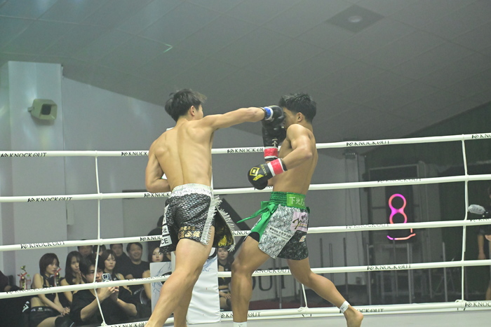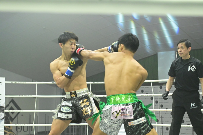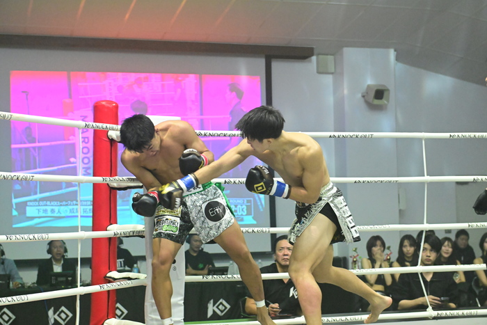 1R、前に出る成尾がいきなり右ストレートの強打を連打する。左ミドルからの右ストレートに、下地はジャブを打つ。すると成尾は右カーフ。前に出る成尾をジャブで迎え撃つ下地はボディもジャブで打つ。右をどんどん繰り出して前へ出る成尾を左フックで迎え撃つ下地。成尾の強烈なワンツーをダッキングでかわす下地。右カーフを蹴っていく下地だが、成尾の圧が強い。